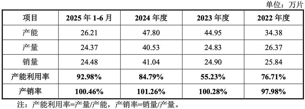 报告期内,其主要产品的产能、产量、销量、产销率及产能利用率情况如下,产品销售单价分别为5909.43元/片、4099.47元/片、3976.39元/片、4237.04元/片,最近两年销售均价相对稳定。