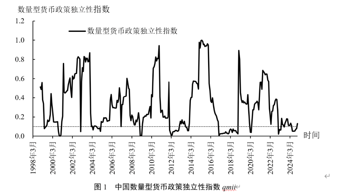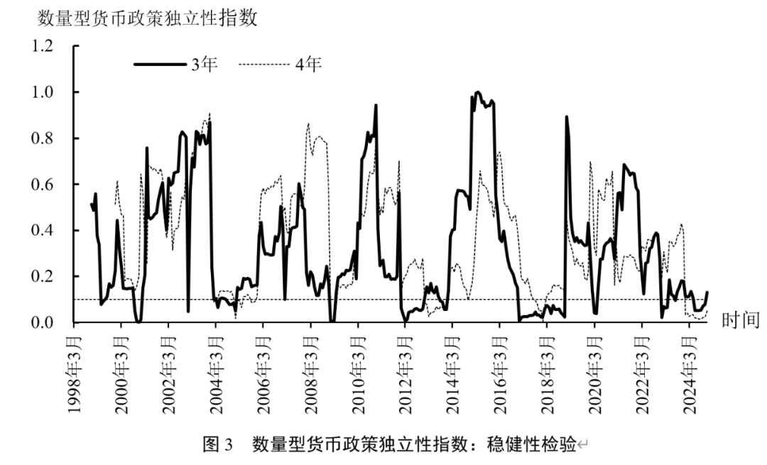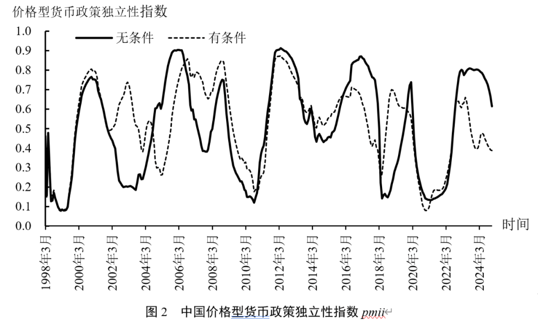 基于中国正在经历货币政策调控框架转型的事实,本文从数量和价格两个层面测算了中国1998年3月~2024年12月的货币政策独立性。测算结果表明:第一,中美共同的经济周期、通胀周期和全球共同因素VIX对中国价格型货币政策制定具有重要影响,在加入这三个因素后,中国价格型货币政策独立性显著提升;第二,国际金融危机期间是中国货币政策不独立的高发期,进入2022年以来,中国数量型货币政策独立性下降,但价格型货币政策做到了“以我为主”,独立性大幅提升。