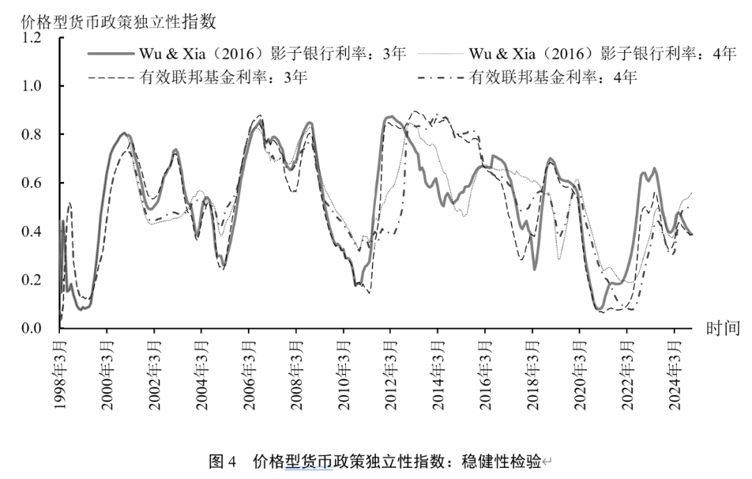 (2)使用有效联邦基金利率。本文使用原始的有效联邦基金利率(ffr)替代Wu & Xia(2016)估算的联邦基金影子利率作为代理变量,重新测算了中国价格型货币政策独立性,测算结果如图4所示。测算结果显示,整体上,两种指标下测算结果在方向上基本一致;在2013-2014年美联储货币政策正常化期间,ffr和ffr_WX有着显著差异,测算的结果表现出明显差异,由ffr_WX测算得到的货币政策独立性明显较低。相较ffr,ffr_WX包含着更多的有关零利率下限条件下有关美联储量化宽松的更多信息,更能够反映美联储真实的货币政策情况,由ffr_WX测算得到的货币政策独立性更加准确。