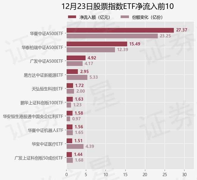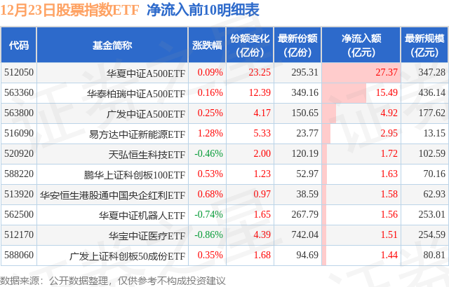 当日有119只股票指数ETF基金出现资金净流入,其中净流入排首位的是华夏中证A500ETF(512050),份额增加了23.25亿份,净流入额为27.37亿元。