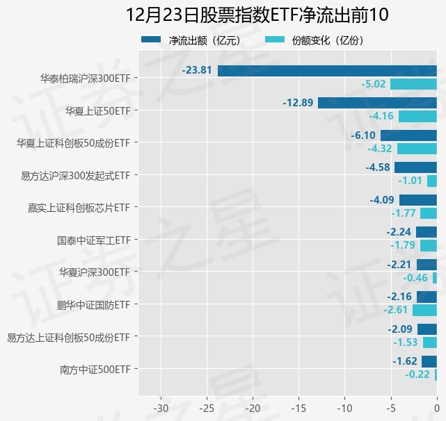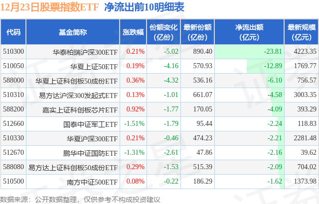 当日有297只股票指数ETF基金出现资金净流出,其中净流出排首位的是华泰柏瑞沪深300ETF(510300),份额减少了5.02亿份,净流出额为23.81亿元。