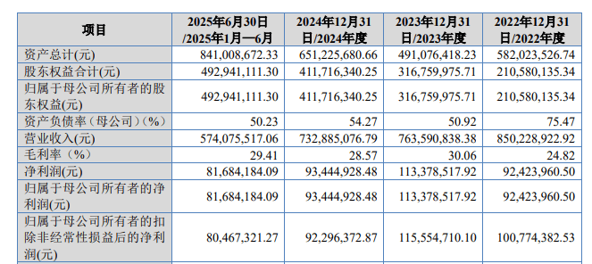 2022年至2024年及2025年上半年(下称“报告期”),公司营业收入分别为8.50亿元、7.64亿元、7.33亿元和5.74亿元,呈显著波动趋势,主要系受下游行业需求变动所致;净利润分别为9242.40万元、1.13亿元、9344.49万元和8168.42万元。