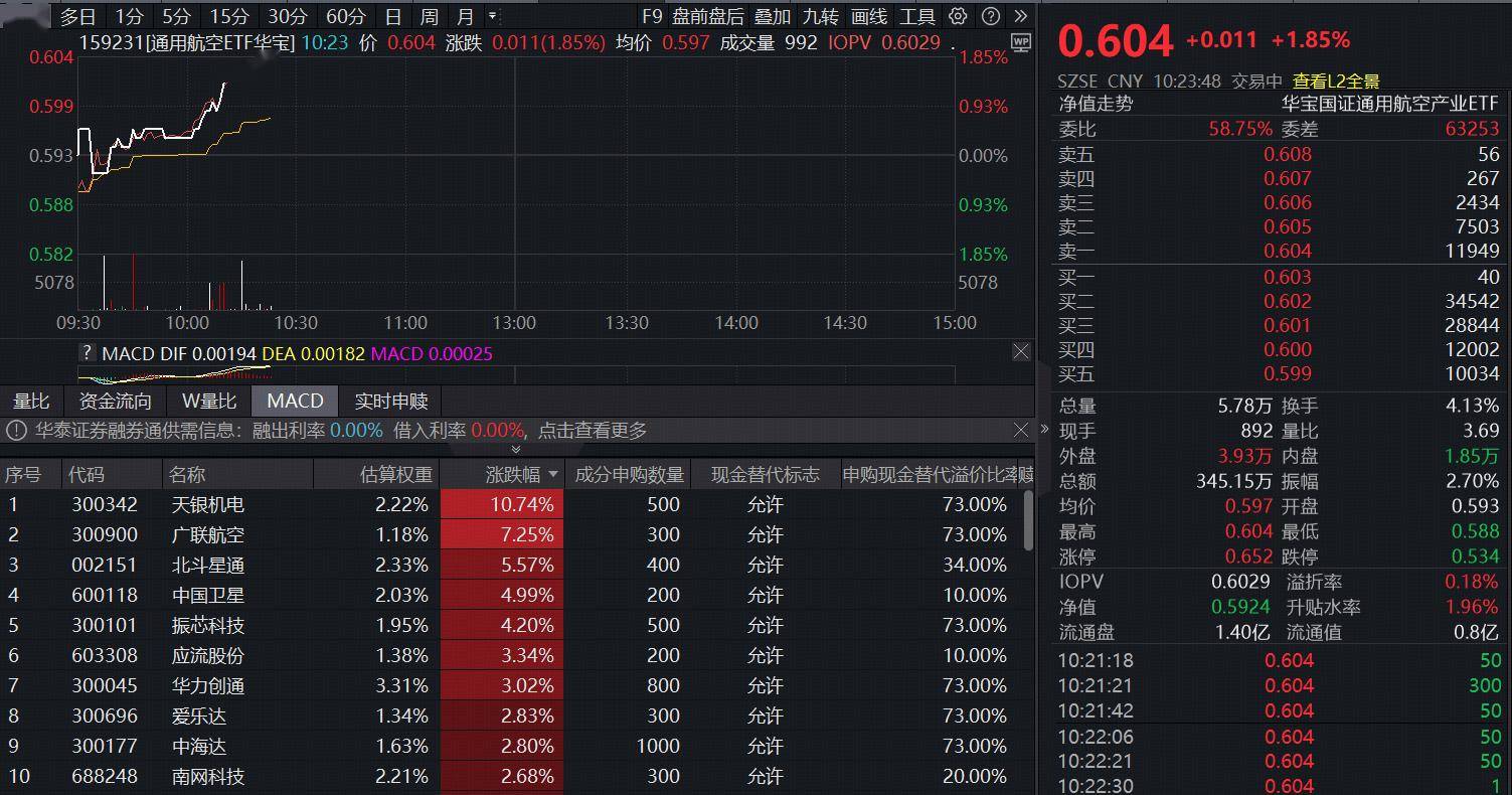 12月24日,航空航天、卫星互联网强势反弹,天银机电涨超13%,广联航空涨超7%,北斗星通涨超6%,中国卫星涨超5%。一键布局低空经济+大飞机+军民融合+商业航天的通用航空ETF华宝(159231)场内价格现涨1.52%,盘中站上5日、10日线。