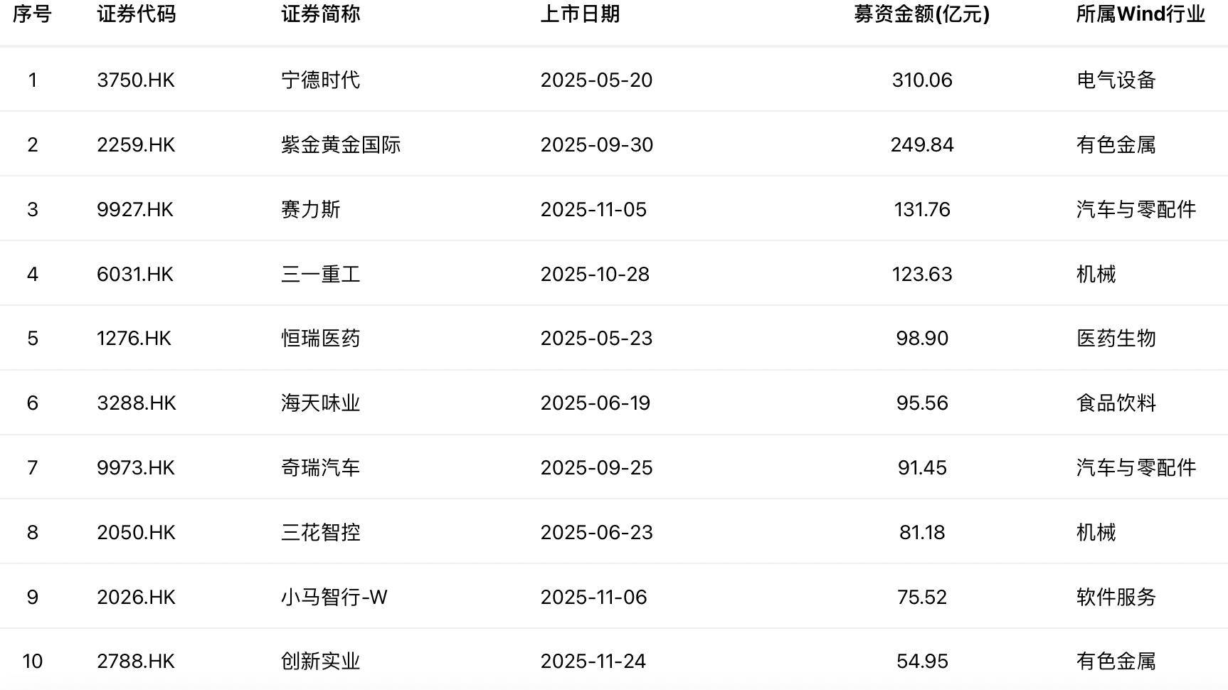 宁德时代以410.06亿港元的募资额成为港股年内“募资王”,并稳坐全球年内新股募资额的“头把交椅”。除宁德时代外,紫金黄金国际、赛力斯、三一重工、海天味业等公司的募资金额也均超过百亿港元。