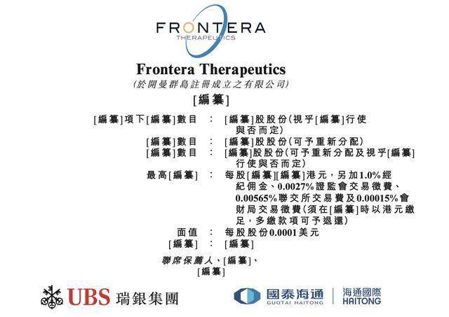 瑞财经 吴文婷12月23日,Frontera Therapeutics(芳拓生物)在港交所递交招股书,瑞银集团、国泰海通担任联席保荐人。