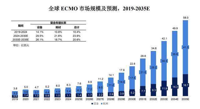 预计未来全球ECMO市场将持续增长,于2030年达到22.8亿美金,2024年至2030年复合年增长率为23.9%;于2035年达到58.0亿美金,2030年至2035年复合年增长率为20.6%。
