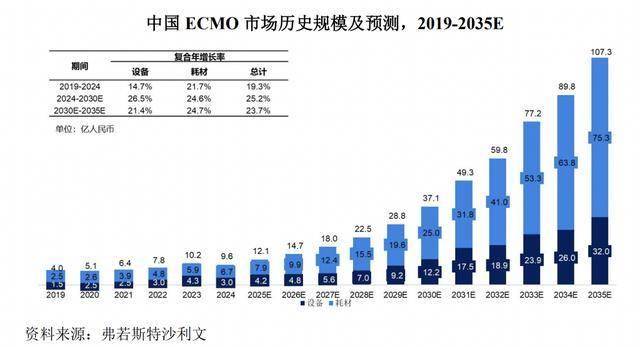 预计未来中国ECMO市场将持续增长,于2030年达到37.1亿人民币,2024年至2030年复合年增长率为25.2%;于2035年达到107.3亿人民币,2030年至2035年复合年增长率为23.7%