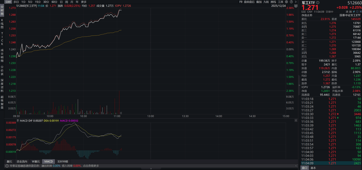 低轨卫星通信正迈入规模化部署与商业化落地的关键阶段,军工行业基本面再受提振,市场认可军工板块高景气,军工ETF(512660)涨超2%。