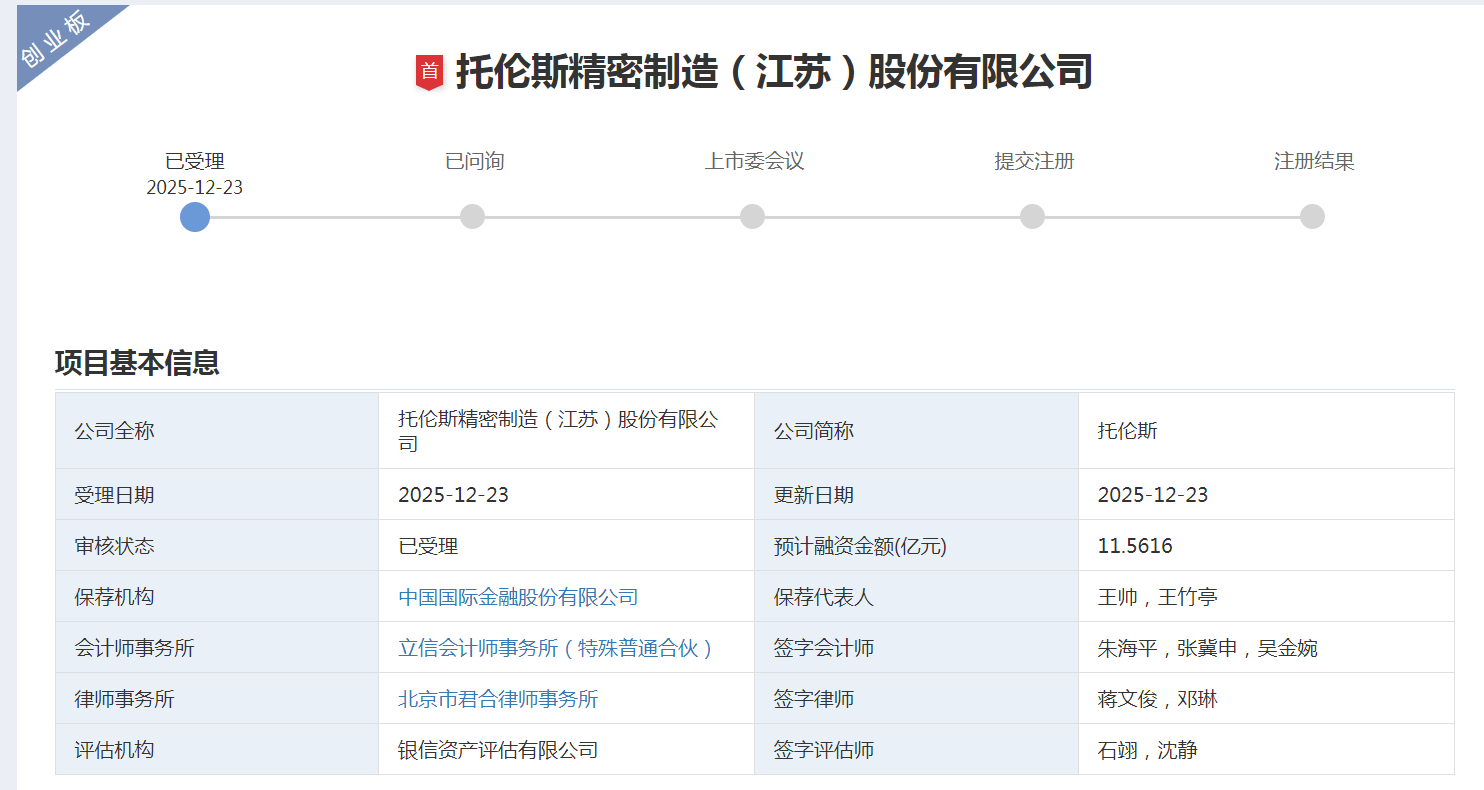 12月23日,托伦斯精密制造(江苏)股份有限公司(以下简称“托伦斯”)创业板IPO获深交所受理,公司拟募资约11.56亿元,扣除发行费用后,将投资于托伦斯精密零部件制造及研发基地项目、补充流动资金。