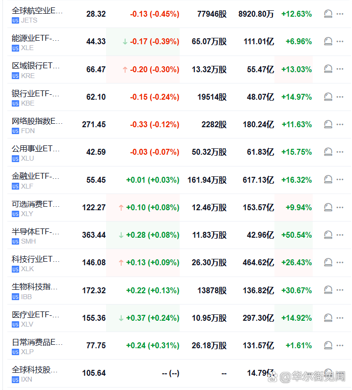 行业ETF美股盘初涨跌各异,全球航空业ETF跌0.45%,能源业ETF跌0.39%,银行业ETF跌0.24%,网络股指数ETF跌0.12%,半导体ETF则涨0.08%,科技行业ETF涨0.09%。
