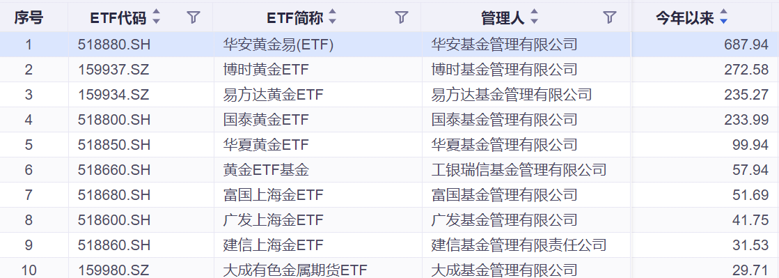 而商品类ETF的增速则依赖于黄金ETF的一路“狂奔”:在地缘局势、央行购金,美联储政策转向灯多重因素共振下,黄金ETF规模一路走高 。截至12月23日,中国市场14只黄金ETF总规模突破2400亿,较年初增长超70%,华安黄金易ETF今年以来净流入687.94亿,净流入居首;博时黄金ETF、易方达黄金ETF、国泰黄金ETF年内规模增长均超200亿。
