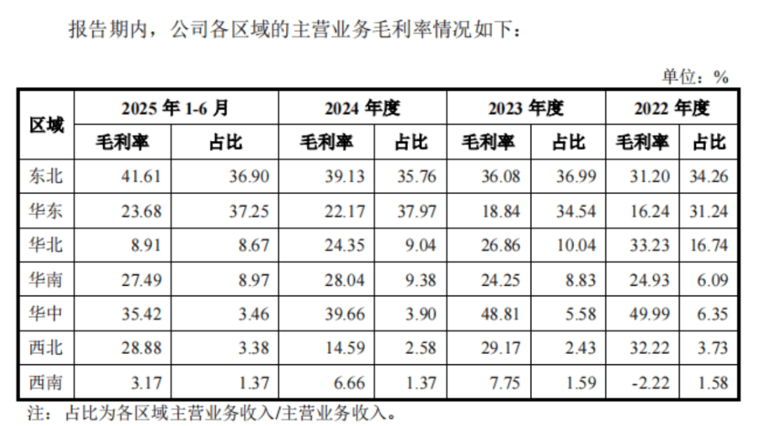 它的业务铺了19个省,最肥的肉在东北,尤其是沈阳。2024年,东北区域贡献了超过35%的收入,毛利率逼近40%,远高于其他地区。