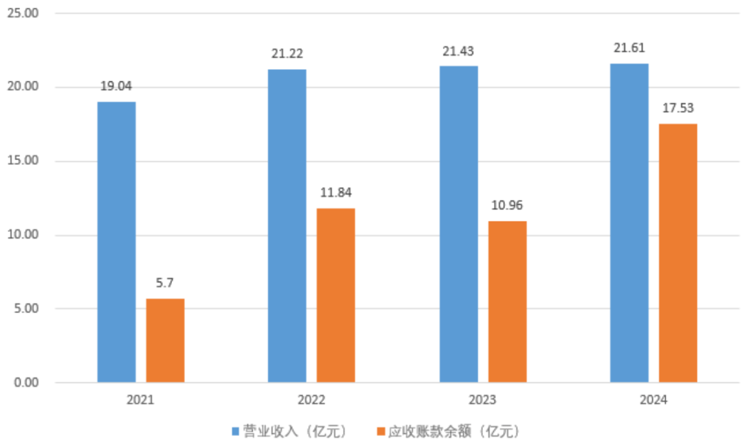 2021年至2024年,公司总营收从19.04亿增至21.61亿,增长平平;但应收账款余额却从5.70亿激增至17.53亿,增长超过3倍。到2025年三季度末,这一数字进一步攀升至18.12亿。