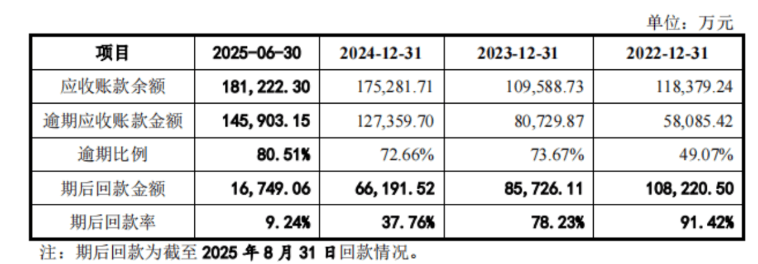 到2025年中,逾期率进一步升至80.5%,期后回款率却骤降至9.2%。