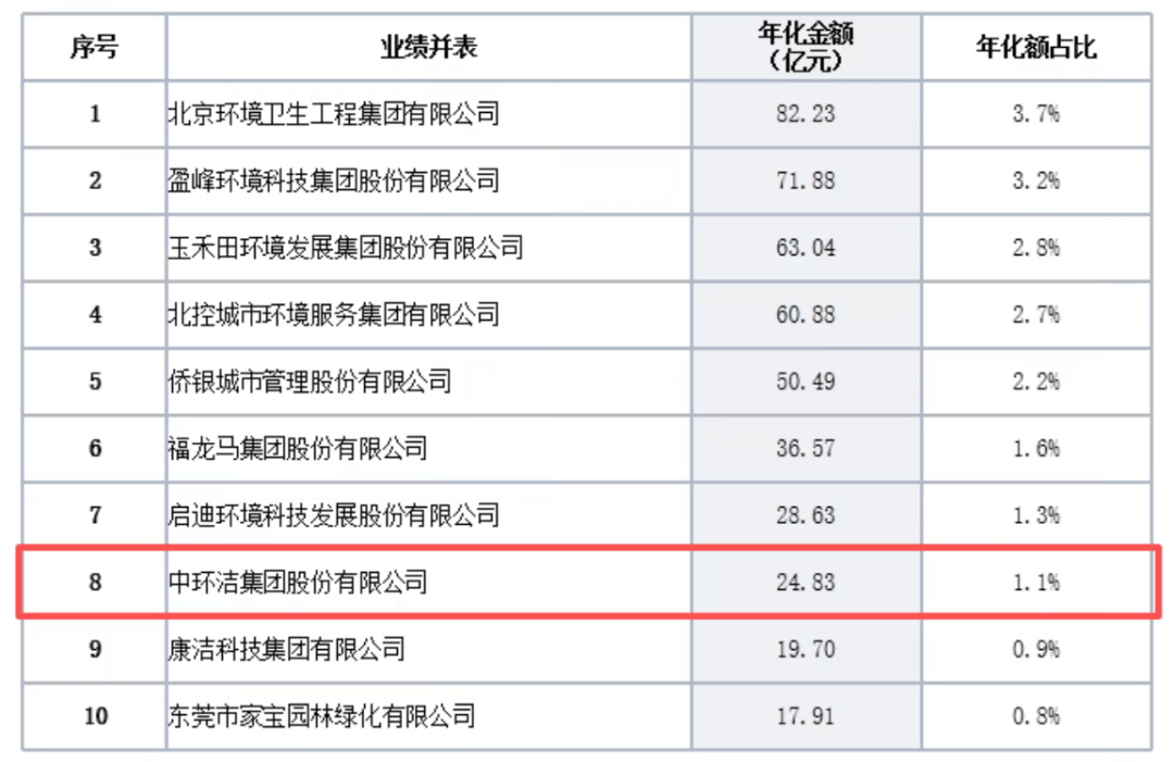 这套模式下,一家环卫公司手里捏着多少“年化合同金额”,直接决定了它在行业内的分量。根据环境司南的数据,2024年末,中环洁这块排名全国第八,但市场份额也只有约1.1%。