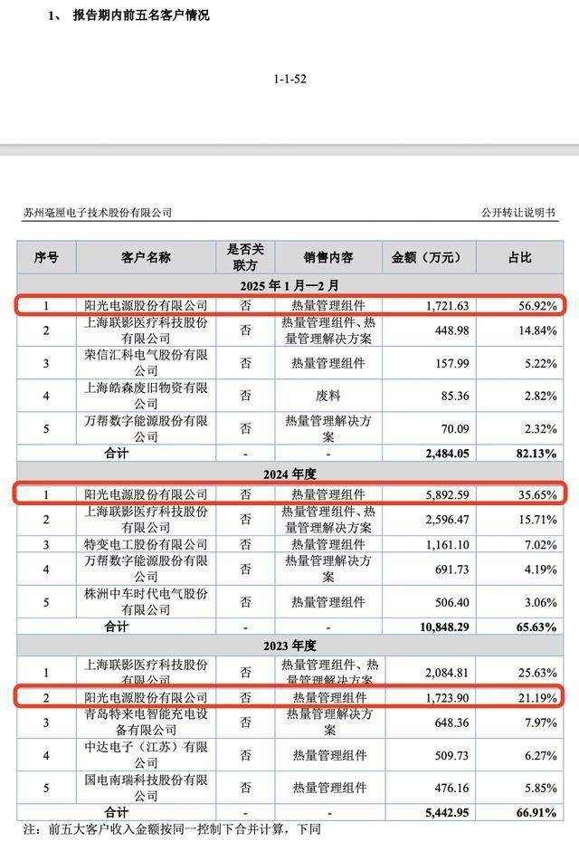 其中,2024年及2025年前两个月,阳光电源均为公司第一大客户,销售占比分别为35.65%、56.92%。
