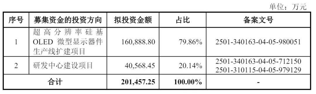 视涯科技计划募资20.1亿元,其中,16.1亿元用于超高分辨率硅基OLED 微型显示器件生产线扩建项目,4.06亿元用于研发中心建设项目。
