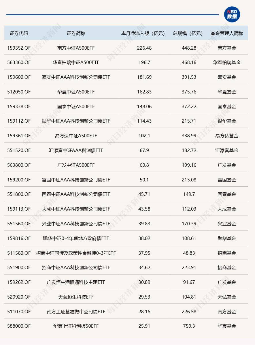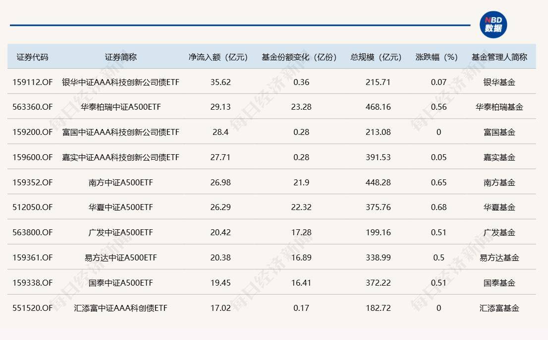 Wind数据显示,在12月24日的非货币ETF市场中,银华中证AAA科技创新公司债ETF基金份额增加0.36亿份,净流入额35.62亿元;华泰柏瑞中证A500ETF份额增加23.28亿份,净流入额29.13亿元;富国中证AAA科技创新公司债ETF份额增加0.28亿份,净流入额28.4亿元。