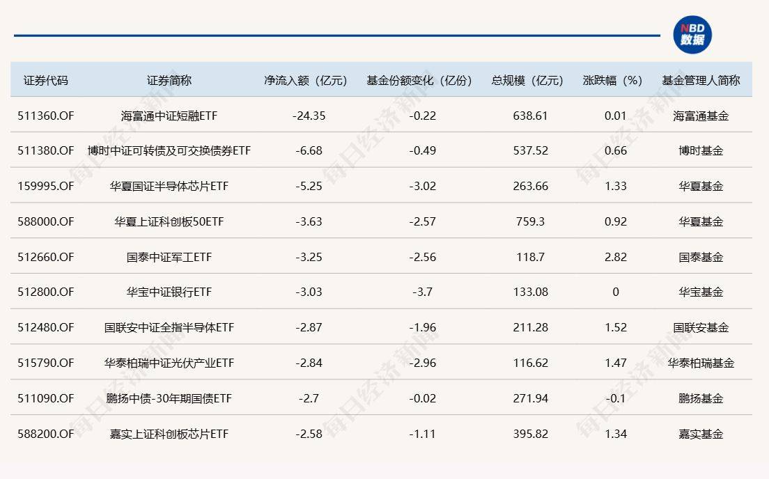 与此同时,海富通中证短融ETF基金份额减少0.22亿份,净流出额24.35亿元;博时中证可转债及可交换债券ETF份额减少0.49亿份,净流出额6.68亿元;华夏国证半导体芯片ETF份额减少3.02亿份,净流出额5.25亿元。