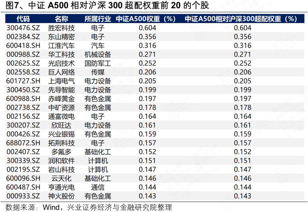 个股方面,中证A500相比沪深300超配比例居前的公司为:胜宏科技、东山精密、江淮汽车、华工科技、光启技术、巨人网络、上海电气、先导智能、赤峰黄金、中矿资源。