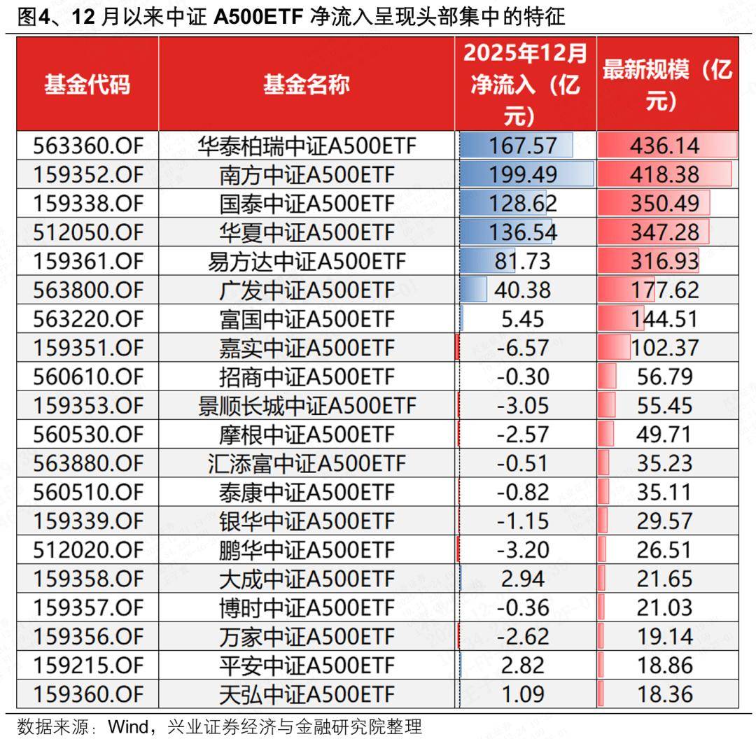 此外,本轮A500ETF净流入呈现头部集中的特征。市面上规模前六大A500ETF产品几乎承接了12月以来所有的净流入,部分规模较小的产品反而有小幅净流出。