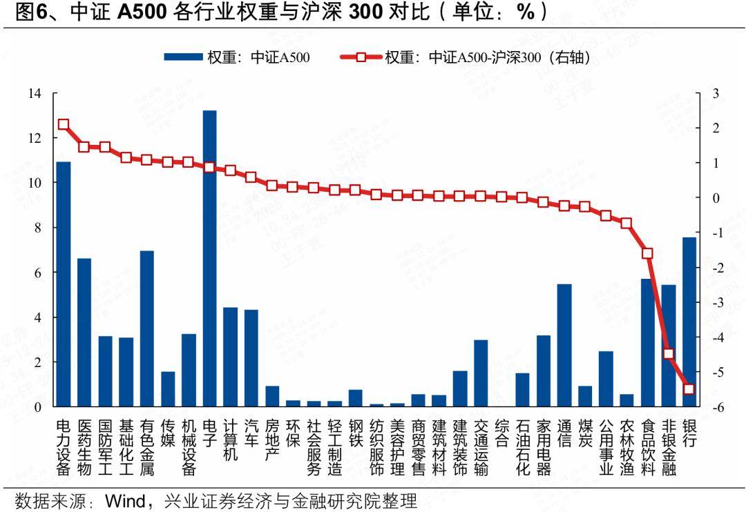 行业影响上,对比沪深300,中证A500超配电力设备、医药、军工、化工、有色较多。中证A500配置电子、电力设备、银行、有色金属、医药生物居前,对比沪深300超配 电力设备、医药、军工、化工、有色较多。