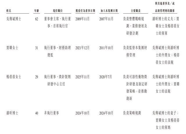 值得一提的是,吴传斌与潘昕的两个外甥女在新济医药担任高管。其中,贾璐任公司执行董事、财务助理总监;杨蓓蓓任公司执行董事、微针制剂研发中心主任。
