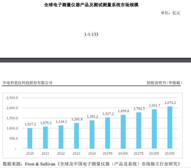 在现代制造产业链条中,从产品基础原件到整机的研究、实验、分析、设计、加工、装备、调试、检验和鉴定等各个环节都需要使用电子测量仪器进行辅助。随着互联网、物联网、云计算、大数据等技术的迅猛发展,传统行业与新科技行业的有机融合,电子测量仪器应用领域得到大幅拓展,市场规模不断扩大。根据Frost&Sullivan《全球及中国电子测量仪器(产品及系统)市场独立行业研究》数据,全球电子测量仪器产品及测试测量系统市场规模从2020年的1,017.2亿元增长至2025年的1,527.2亿元,对应年均复合增长率8.47%;预计从2025年的1,527.2亿元将进一步增长至2029年的2,074.2亿元,对应年均复合增长率7.95%。