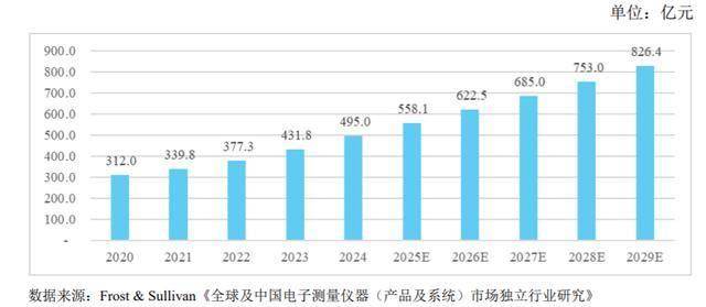 近年来,得益于一系列的政策支持、5G商业化应用的深入推进、新能源汽车市场的快速渗透以及信息通信技术和工业生产力的同步提升,我国电子测量仪器行业取得了显著进步。根据Frost&Sullivan《全球及中国电子测量仪器(产品及系统)市场独立行业研究》数据,中国电子测量仪器产品及测试测量系统市场规模由2020年的312.0亿元增长至2025年的558.1亿元,对应年均复合增长率12.33%,2025年中国电子测量仪器市场规模约占全球市场规模的36.54%;预计中国电子测量仪器产品及测试测量系统市场规模将由2025年的558.1亿元进一步增长至2029年的826.4亿元,对应年均复合增长率10.31%。