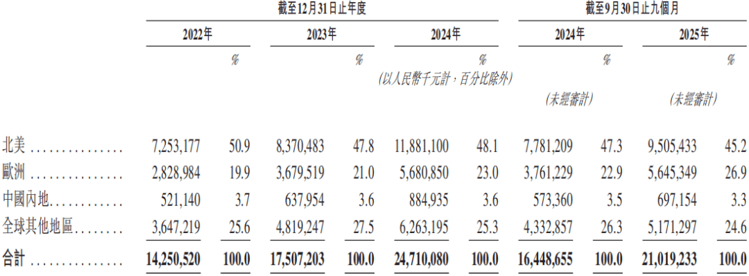业绩方面,据招股书数据显示,2022年至2024年及2025年1—9月(下称报告期),安克创新业绩高速增长,总收入从2022年的142.51亿元增长至2024年的247.10亿元,年复合增长率达到31.7%,2025年前9个月已实现收入210.19亿元;各期净利润分别为11.85亿元、16.94亿元、22.11亿元、19.69亿元。