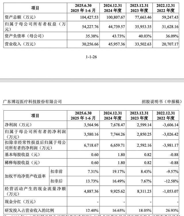 据招股书,2022年-2024年及2025上半年,博迈医疗实现营收分别为2.07亿元、3.35亿元、4.6亿元、3.03亿元;归母净利润分别为-3026.42万元、2850.25万元、7744.26万元、3580.16万元。