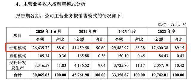 值得注意的是,博迈医疗的产品销售以经销模式为主,报告期内,公司主营业务收入中经销模式占比为89.15%、88.38%、90.60%和88.61%。
