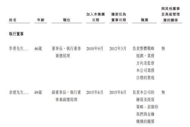 余建,49岁,副董事长、执行董事兼公司副总经理,主要负责公司的融资及投资策略,并维持公司与金融机构的关系。他于2015年6月加入公司,担任副总经理,并于2015年8月获委任为执行董事、副董事长。