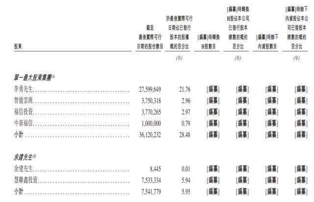 IPO前,李勇及其控制的实体,合计持股约28.48%,为单一最大股东集团;此外,余建合计持股5.95%。