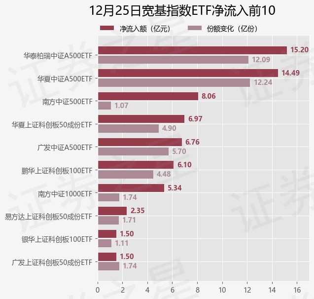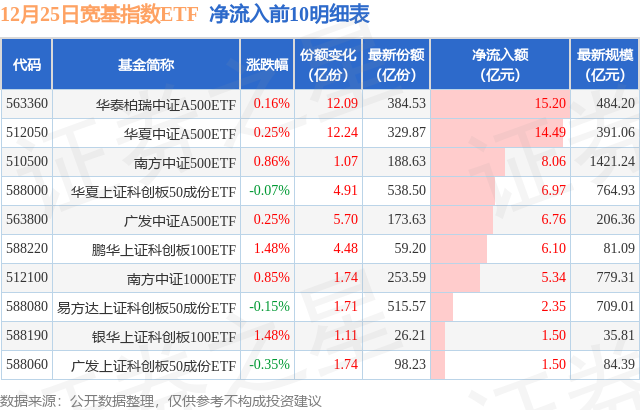 当日有36只宽基指数ETF基金出现资金净流入,其中净流入排首位的是华泰柏瑞中证A500ETF(563360),份额增加了12.09亿份,净流入额为15.2亿元。