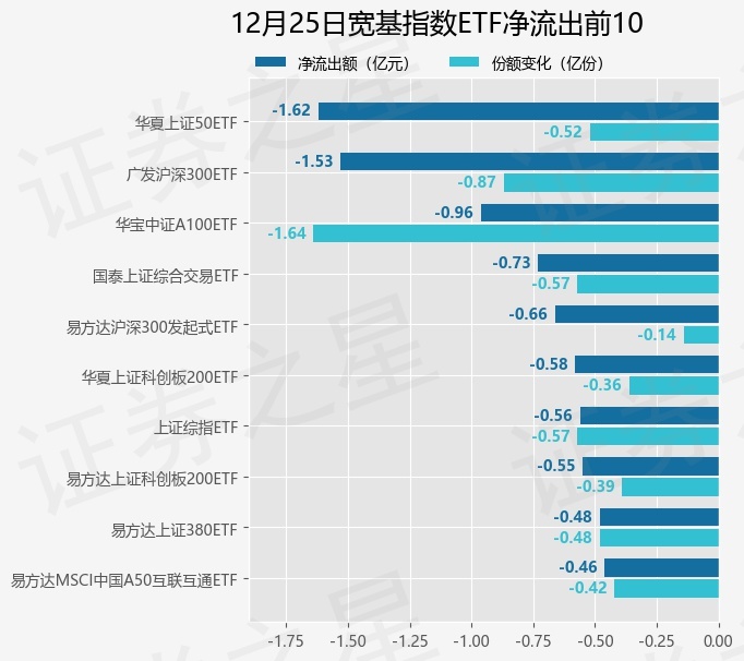 当日有66只宽基指数ETF基金出现资金净流出,其中净流出排首位的是华夏上证50ETF(510050),份额减少了5220.0万份,净流出额为1.62亿元。