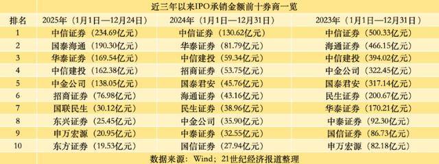 另一家值得特别留意的券商是华泰证券,其2025年承销金额已逼近2023年水平。2023年,华泰证券IPO承销金额为170.21亿元,位列行业第七;而2025年1月1日至12月24日,其IPO承销金额已达169.54亿元,位居行业第三。而其他近三年来IPO承销金额均位列券业前十的头部券商,2025年IPO承销金额均与2023年存在较大差距。
