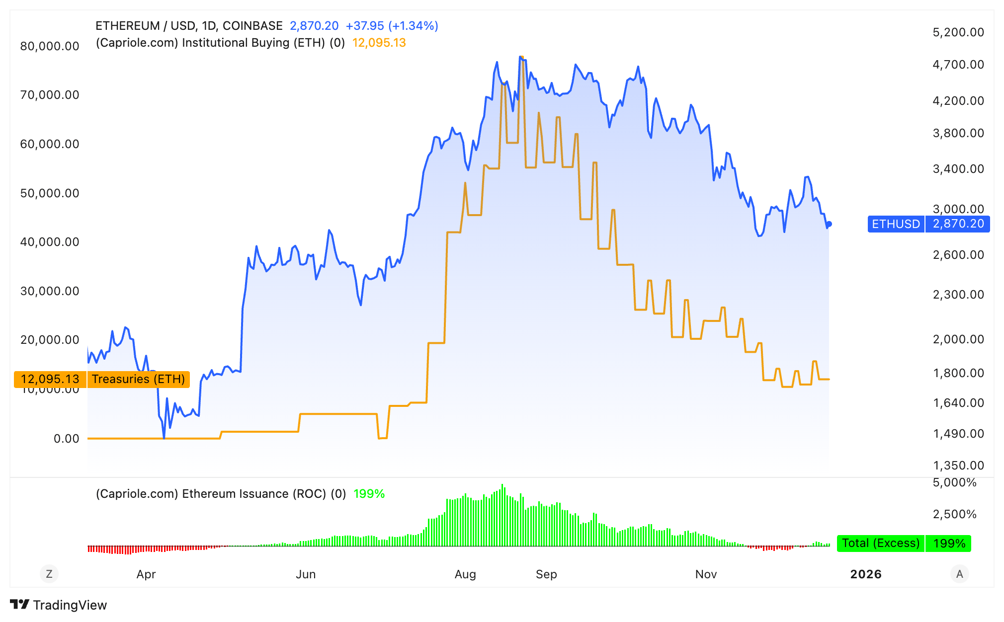 Capriole Investments提供的补充数据显示,以太币财库公司的日均购买量已从8月23日的78,010枚ETH峰值下滑至每天12,095枚ETH。