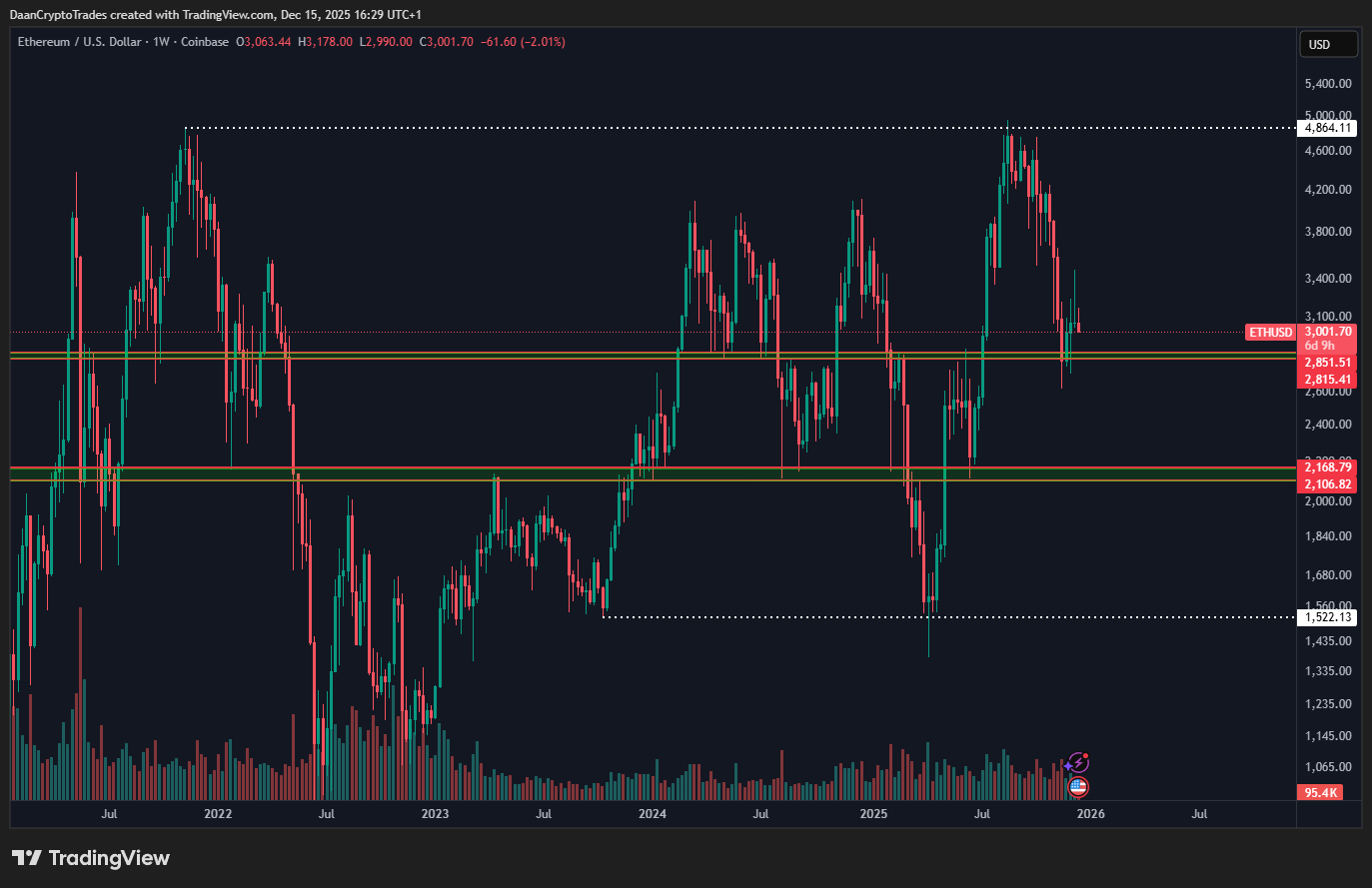 以太币(ETH)已从其4950美元的历史高点回调42%,市场交易者正密切关注这一主流加密货币可能在何处筑底。