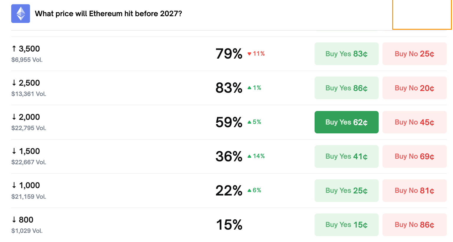以太币在2026年12月31日前的价格目标。来源:Polymarket