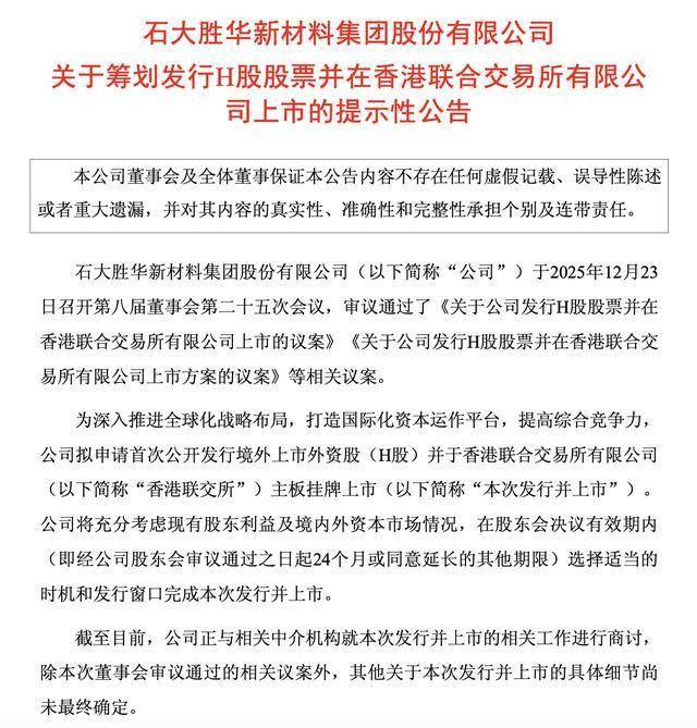 瑞财经 吴文婷12月23日,石大胜华发布公告称,公司于2025年12月23日召开第八届董事会第二十五次会议,审议通过了《关于公司发行H股股票并在香港联合交易所有限公司上市的议案》《关于公司发行H股股票并在香港联合交易所有限公司上市方案的议案》等相关议案。