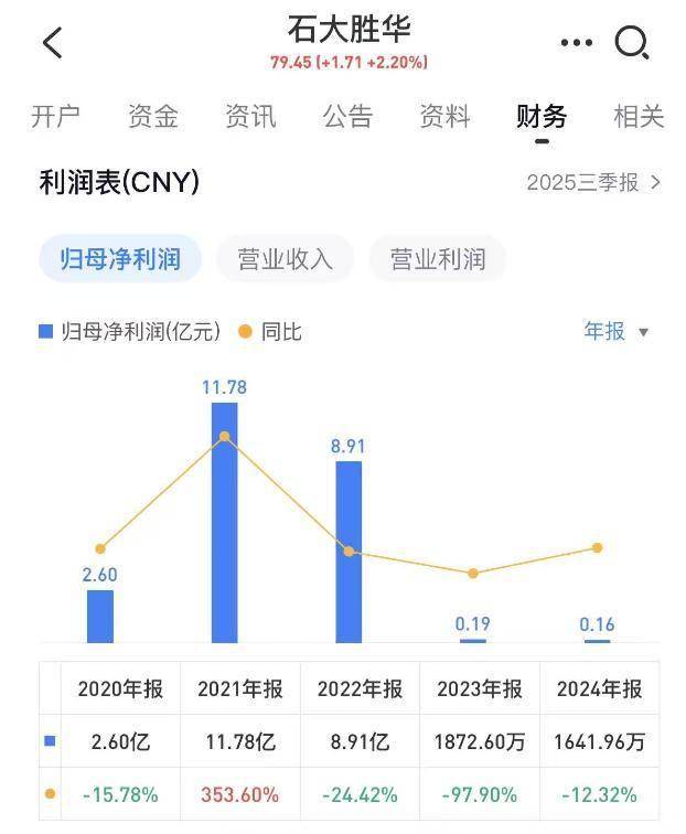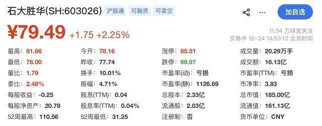 截至发稿时,石大胜华A股报79.49元,涨2.25%,总市值约185亿元。