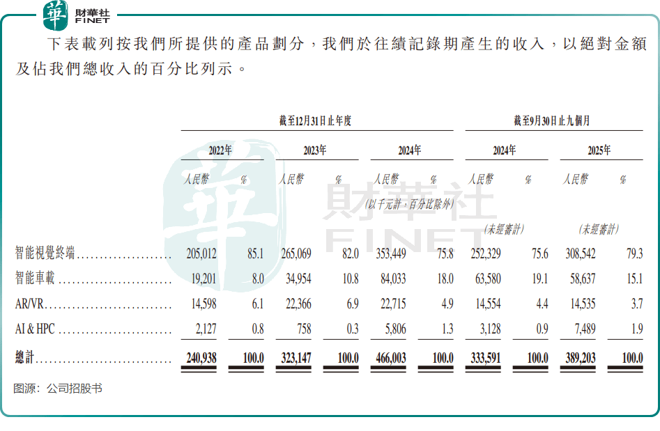 按收入划分,公司业务分为智能视觉终端、智能车载、AR/VR以及AI&HPC。其中,智能视觉终端是公司收入大头,业务集中度偏高。2025年前三季度,智能视觉终端芯片收入为3.09亿元,占总收入的79.3%。而AR/VR与AI业务尚未形成规模支撑。
