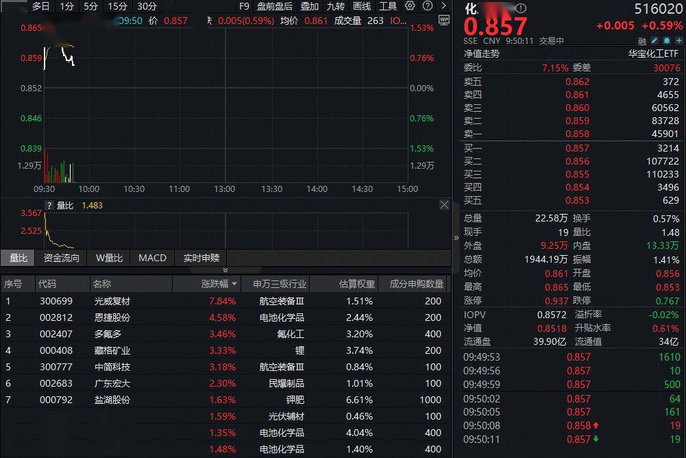 成份股方面,航空装备、锂电、氟化工等板块部分个股涨幅居前。截至发稿,光威复材飙涨超7%,恩捷股份大涨超4%,多氟多、藏格矿业、中简科技涨超3%,广东宏大涨超2%。