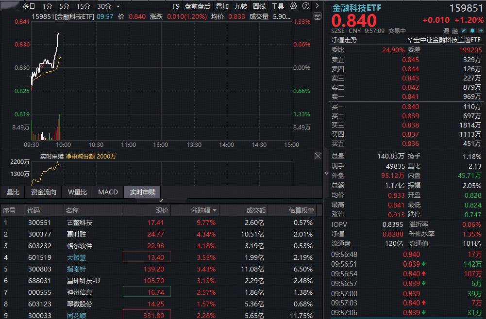 26日早盘,大盘八连阳冲击4000点之际,金融科技明显异动拉升。其中,古鳌科技领涨超7%,赢时胜、格尔软件、大智慧等涨超4%,指南针、神州信息、同花顺等多股涨超2%。热门ETF方面,同类规模最大、流动性最佳的金融科技ETF159851)场内快速上扬逾1%,冲击三连阳,资金实时净申购2000万份。