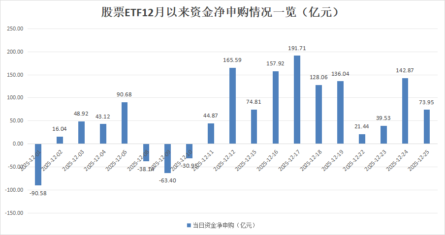 据银河证券基金研究中心数据统计,12月25日,全市场股票ETF(含跨境ETF)资金净流入超73亿元,12月以来资金净流入超过1100亿元。