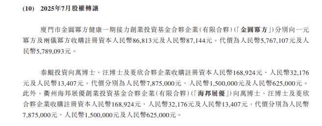 与估值大幅攀升形成鲜明反差的是,凌科药业在IPO前夕出现股东低价转让股权的现象,且同期股权转让价格存在显著差异。招股说明书显示,2025年7月,金圆幂方分别向一元幂方及两仪幂方收购注册资本人民币86,813元及人民币87,144元,代价为人民币5,767,107元及人民币5,789,093元,折合每股66.43元;泰鲲投资向万博士、汪博士及菱欣合伙企业收购注册资本人民币168,924元、人民币32,176元及人民币13,407元,代价分别为人民币7,875,000元、人民币1,500,000元及人民币625,000元,折合每股46.62元;海邦展优向万博士、汪博士及菱欣 合伙企业收购注册资本人民币168,924元、人民币32,176元及人民币13,407元,代价分别为人民币7,875,000元、人民币1,500,000元及人民币625,000元,折合每股46.62元。这意味着在同一时间段内,金圆幂方收购股权的每股价格,比泰鲲投资、海邦展优的收购价高出42.49%,价格差异悬殊,