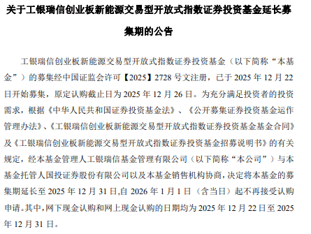 公告称,工银瑞信创业板新能源交易型开放式指数证券投资基金的募集经中国证监会许可【2025】2728号文注册,已于2025年12月22日开始募集,原定认购截止日为2025年12月26日。现决定将该基金的募集期延长至2025年12月31日,自2026年1月1日(含当日)起不再接受认购申请。其中,网下现金认购和网上现金认购的日期均为2025年12月22日至2025年12月31日。