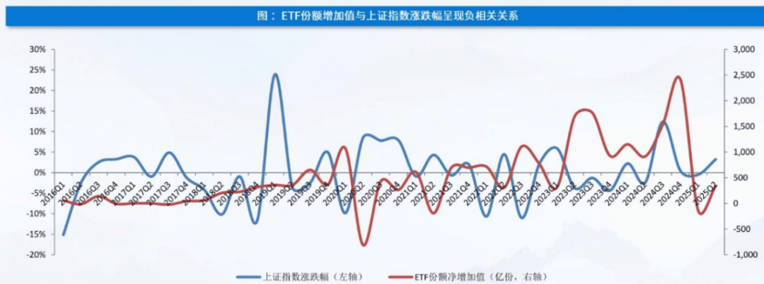 这一点也可以从ETF相关数据上证明。根据国泰海通证券的另一份研报显示,ETF份额增加值与上证指数涨跌幅呈现负相关关系。