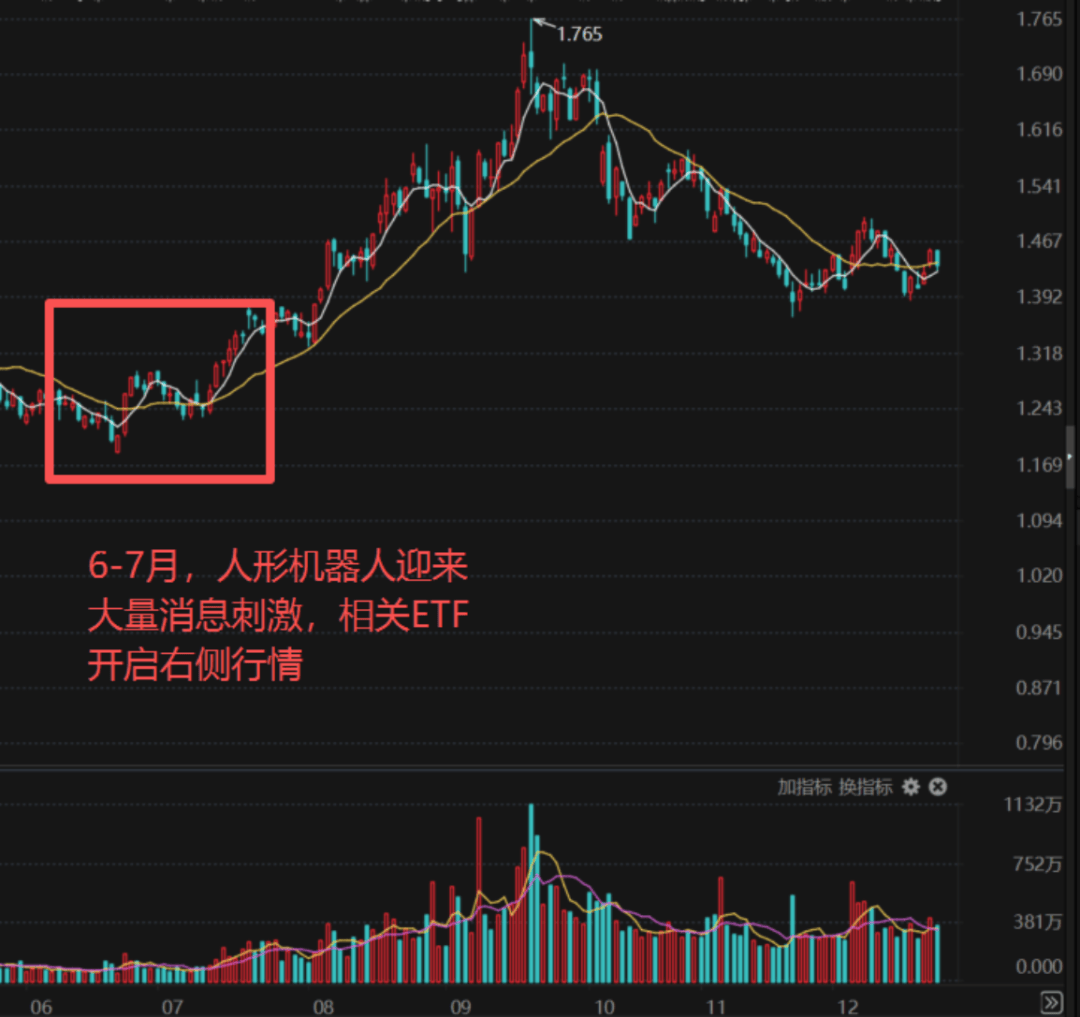 在这种密集的消息催化下,机器人ETF易方达在6月24日大涨4.2%,突破20日均线,随后小幅回调至7月中旬,在20日均线附近震荡几日后开启主升浪,49个交易日上涨38.1%。